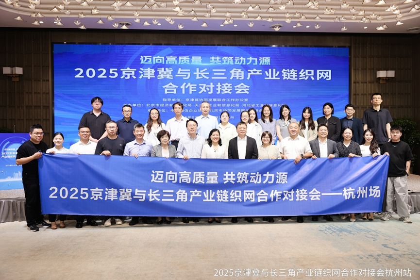 2025京津冀与长三角产业链织网合作对接会主题为“迈向高质量,共筑动力源”,由京津冀协同发展联合工作办公室指导,北京市经济和信息化局、天津市工业和信息化局、河北省工业和信息化厅主办,中国通信企业协会、北京市协同发展服务促进会承办,数十家单位及企业代表共同参会。